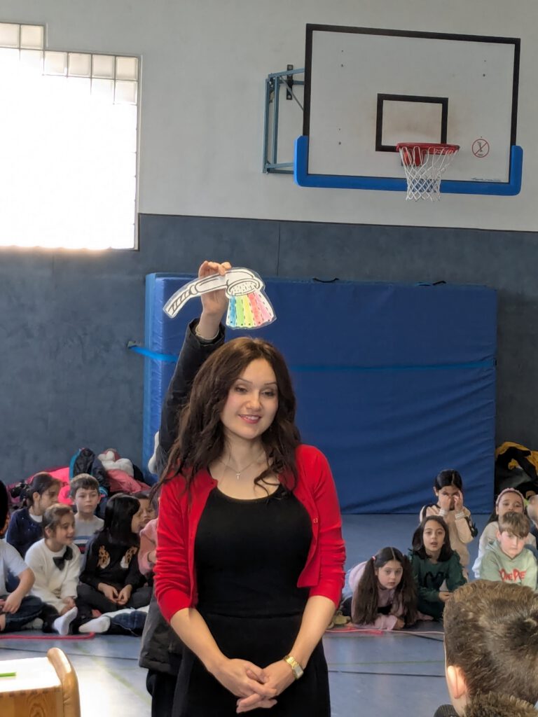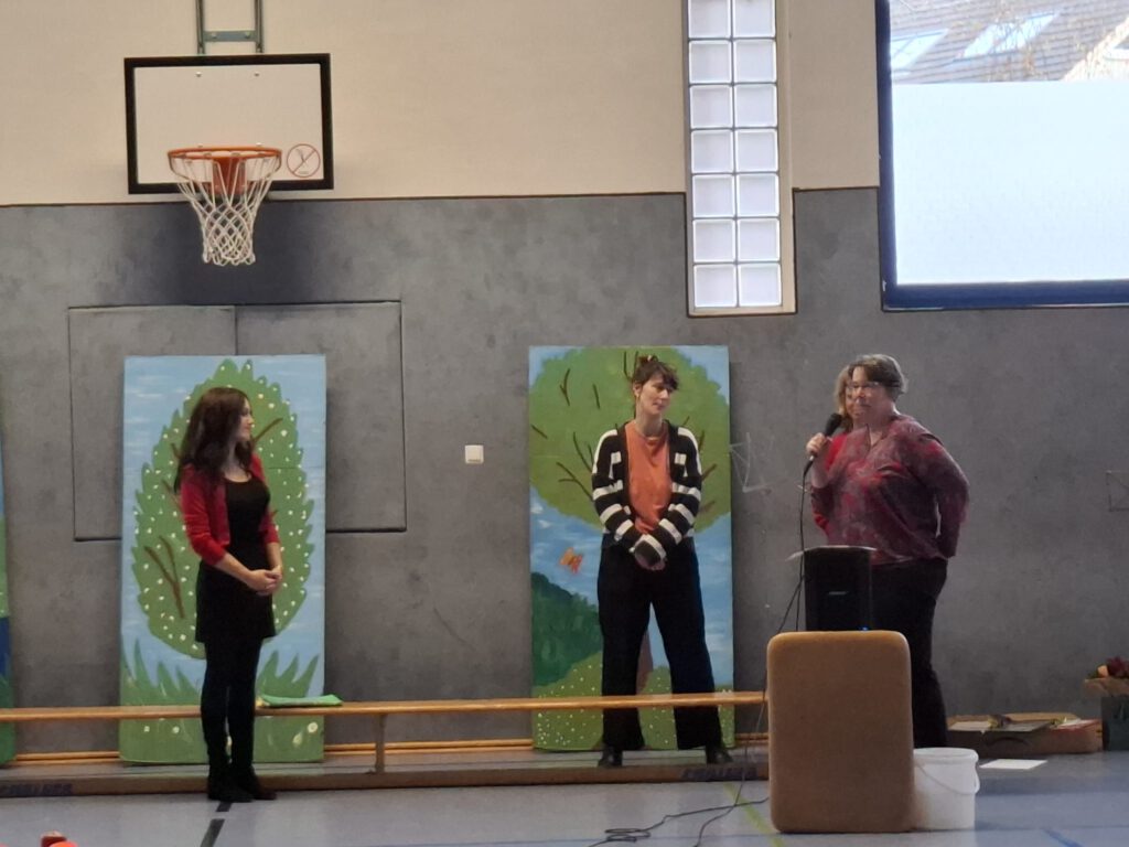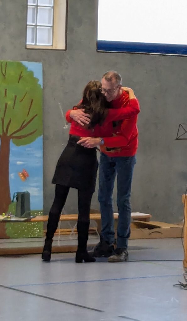 Ein besonderer Moment der Feier war die Verabschiedung von Frau Kindop, einer langjährigen, sehr engagierten und bei allen sehr beliebten Lehrerin. Die Klasse 4b hatte eigens für sie einen Sketch einstudiert und mit viel Freude aufgeführt. Auch das Kinderparlament, der Lehrerrat und die OGS-Kollegen und Kolleginnen überreichten liebevoll ausgewählte Geschenke. Für einen besonders emotionalen Augenblick sorgte das Abschiedslied, das die Lehrkräfte für Frau Kindop vorgetragen hatten.