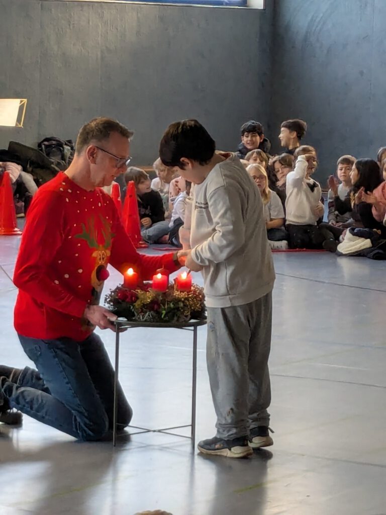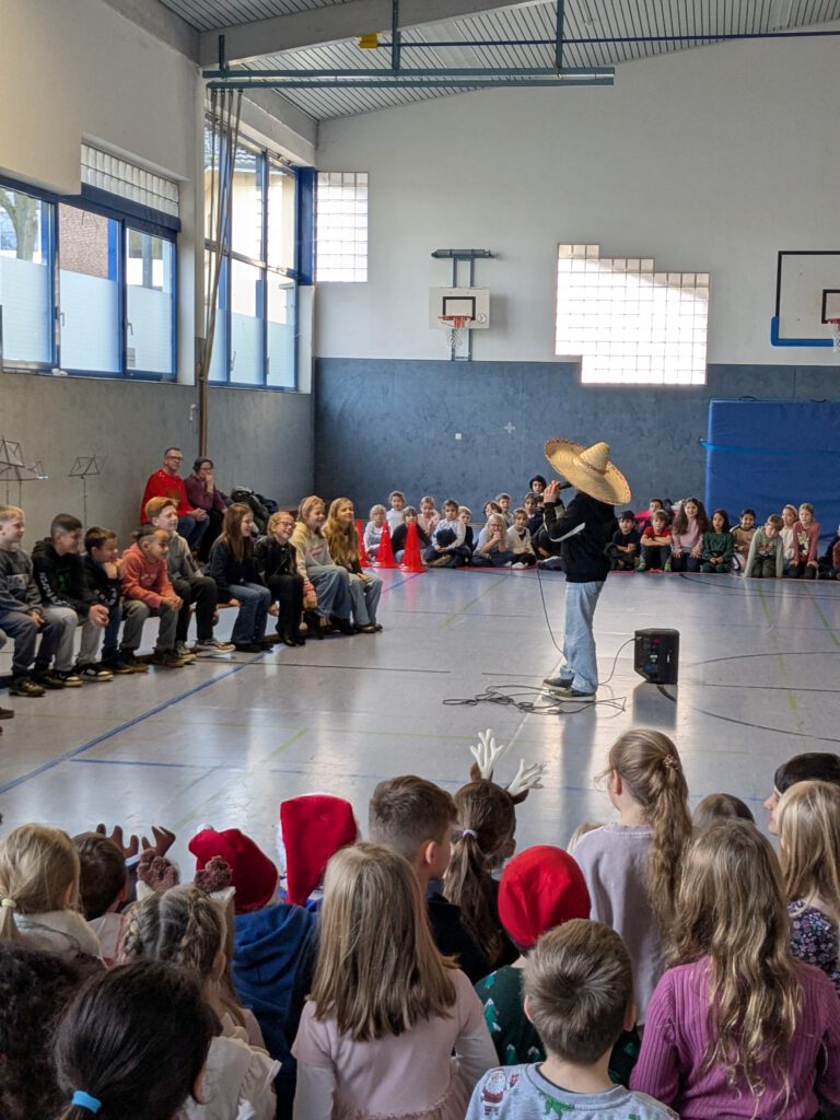 Gestern fand unsere diesjährige Weihnachtsfeier statt. Herr Kuhlemann begrüßte alle Kinder, Kolleginnen und Kollegen und einige Eltern herzlich und stimmte auf einen festlichen Vormittag ein.