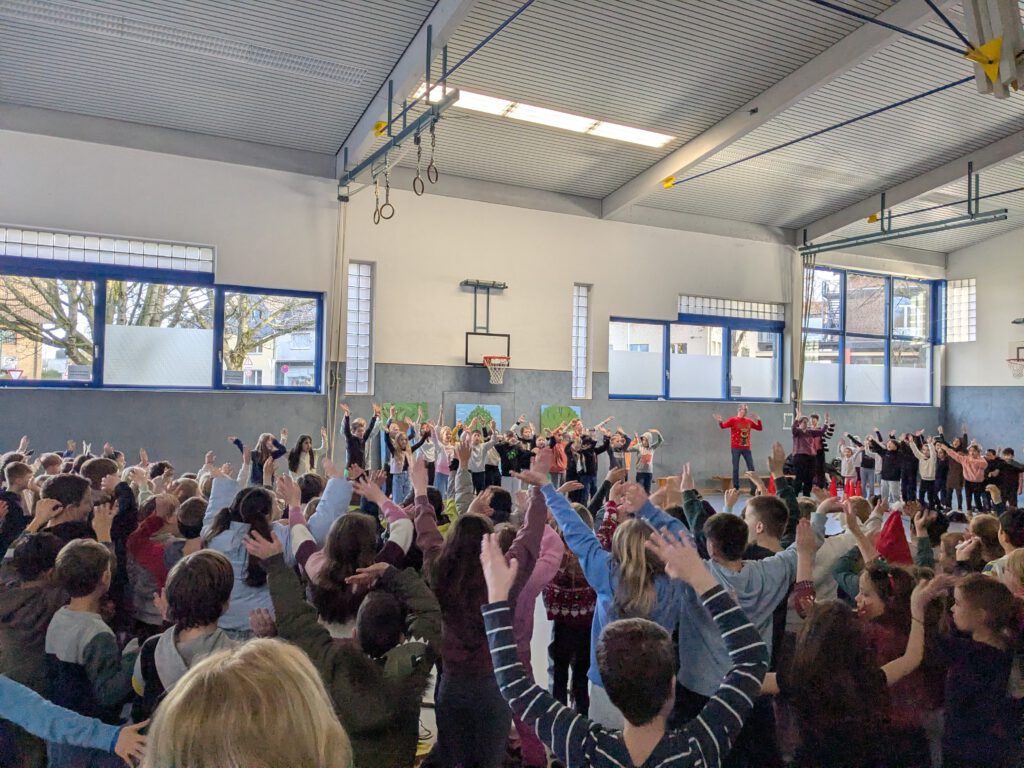 Zum fröhlichen Abschluss der Feier tanzten alle gemeinsam den Weihnachtsmambo unter der Leitung von Frau Peters und Frau Volkmer.