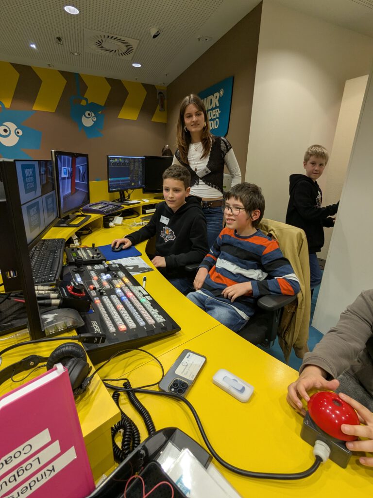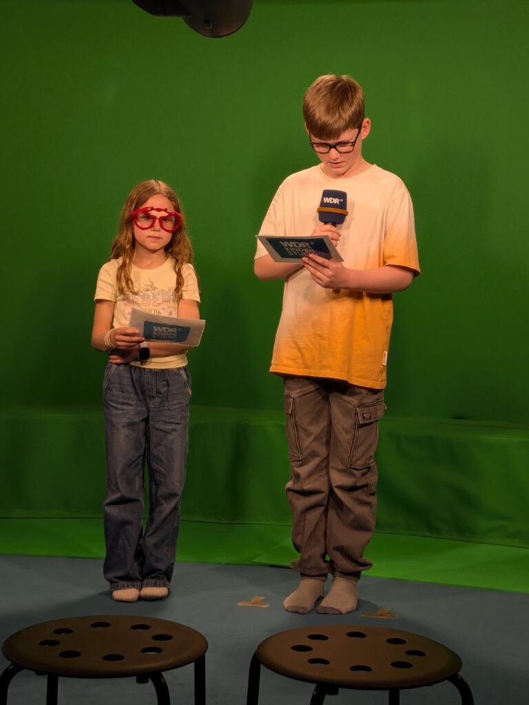 In kleinen Gruppen wurde eine eigene Nachrichtensendung produziert. Einige Kinder standen vor der Kamera und sprachen die Nachrichten ins Mikrofon, andere kümmerten sich um die Technik, bedienten die Kamera oder gaben Regieanweisungen. So entstand Schritt für Schritt eine (fast) professionelle Fernsehsendung.